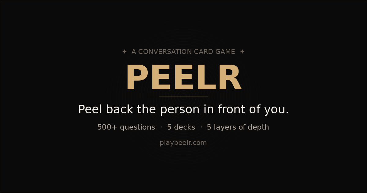 Peelr was built for those moments. The dinner that could go deeper. The road trip that needs a spark. The couple that's been together for years but still has layers left to discover. The coworkers who are more than their job titles. The stranger who might change how you see the world.